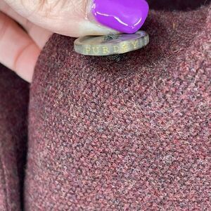 • Horn buttons. Shoulder pads. Buttoned cuffs. Two front welt pockets. Button fastenings through front. Back vent. Slightly stretchy fabric. Mid-Weight fabric. Suede elbow patches. 100% Cashmere. Color: Merlot. Style No: 105150.