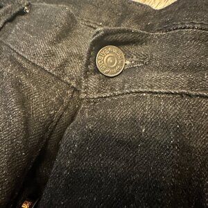 Woven using vintage machines and feature PBJ's subtle stubby irregular vertical texture. Using a black sulphur dyed on weft & warp, with wear, you will see lightning strike white appear!