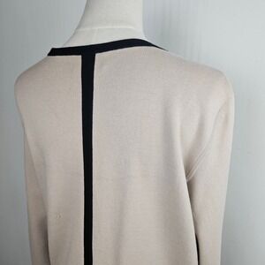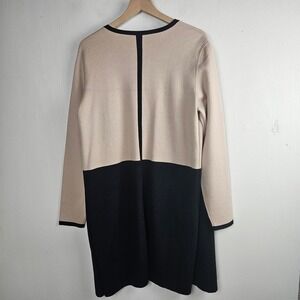 Key features: beige/black color block, open waterfall front, pockets, longer length, ponte knit material