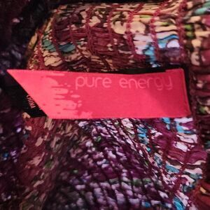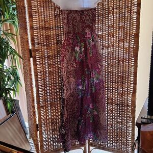 Elegant strapless dress by Pure Energy. Features a burgundy base with floral patterns. Perfect for any occasion.