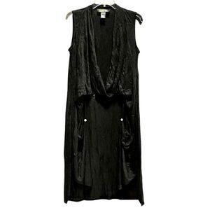 This sheer sleeveless pullover duster vest crosses at the waist and open below for a high/low effect hemline. It has buttons sewn in place lower down the front creating drape and fullness. It has a loose fitting a-line cut. It is made of a sheer crinkled dark black polyester fabric. In excellent used condition.