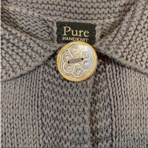 Pure Handknit cotton cardigan in a deep taupe color, size small/xtra small. Button up front with a collar around the neckline, two buttons in the back, all buttons are functional, 100% cotton.