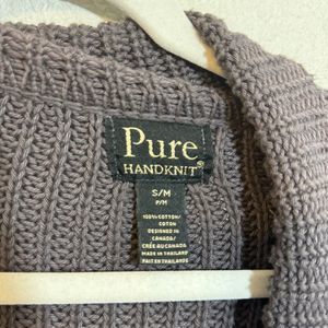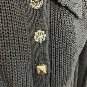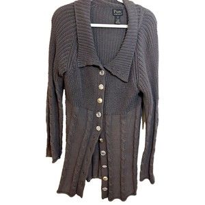 Pure Handknit Cotton Long Cardigan 5 Jewel Button Closure w/slits Gray S/M