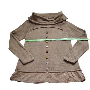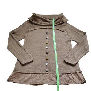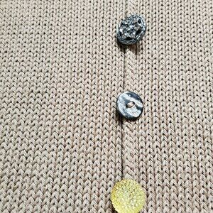 Add an element of both whimsy and chicness to any outfit with this unique pullover sweater.  Very interesting buttons and not the cotton fabric detail around the bottom.