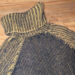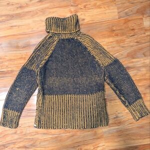 Excellent condition Pure Knitted By Hand sweater. Great brand and quality cable knit two-tone piece. Contrasting black and gold stitching throughout the piece gives the turtleneck character. Estimated to be a women's small, no tags, see measurements.