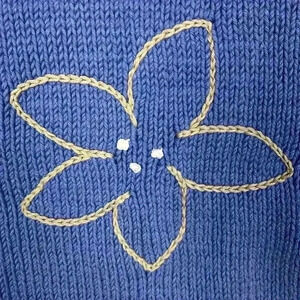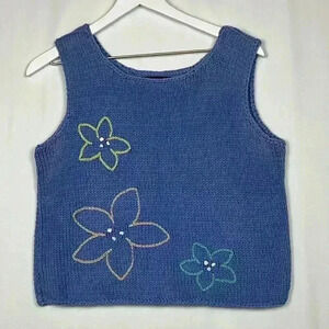 Pure Handknit Womens Vest Blue S/M Sleeveless Round Neck Pullover Embroidered Flowers Vintage Whimsical Cute EUC