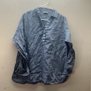 Pure J. Jill Love Linen 100% linen Pullover Button Front Henley Tunic Blouse Roll Tab Sleeves XS chambray blue denim look Lagenlook minimalist relaxed coastal summer lightweight