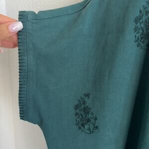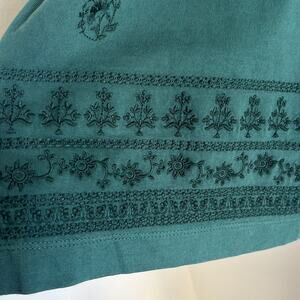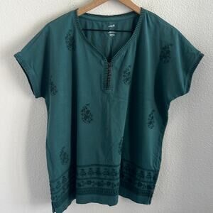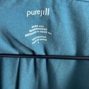 Pure Jill Embroidered Buttoned V-Neck Tee Green Boho Feminine 100% Cotton Small