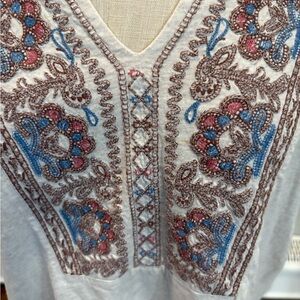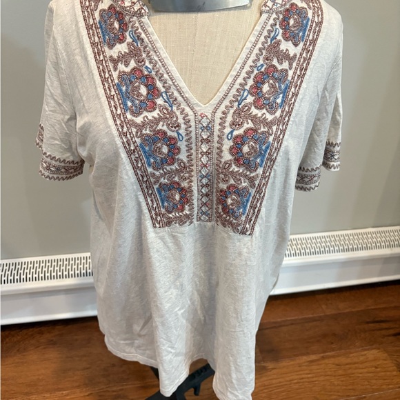 Pure Jill embroidered tee in a soft cream color. 100% cotton for comfort. 20” armpit to armpit. 25 1/2 inches long. Tiny hole see pic
