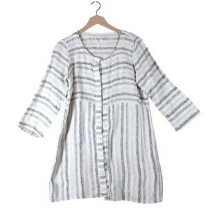 This Pure Jill tunic dress channels relaxed elegance with its soft structure and breathable blend of 56% cotton and 44% linen. Done in a lightweight semi-sheer slub weave, the striped pattern shifts from horizontal to vertical across the body for subtle visual interest and movement. Size small, easy button front design.