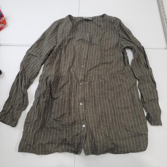 Pure Jill Linen Tunic Shirt Womens Small Green Stripe Long Sleeve Button Front