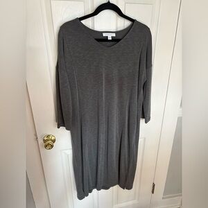 The brownish-gray hue adds earthy elegance, while the side-split hem, slight V-neckline, and ¾ sleeves create a flattering silhouette you can wear as a tunic or a dress. Style it with sandals for an easy coastal look or layer with leggings and boots for fall.