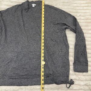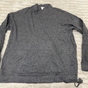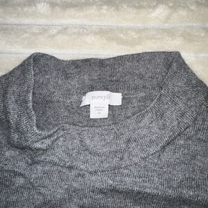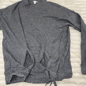 This is a preowned Pure Jill Women Gray Long Sleeves Pullover Sweater Size Medium. It is in good preowned condition. The string tie at the bottom of the shirt is out of place. You will need to adjust it yourself. Please look at the pictures for the condition of the sweater.