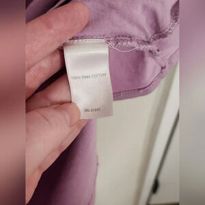 Pretty lavender color, 100% Pima cotton, flat front pockets, 3/4 sleeves, great for spring and summer