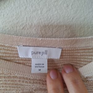 Pure Jill Sweater. Linen Blend. Rounded neckline. Long sleeve. Relaxed fit. Oatmeal/Ivory. Textured pattern. Lightweight