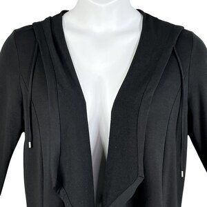 Pure Jill Womens Size Small Black Hooded Wrap Cardigan Pockets Jersey Knit Jacket Cascading Open Front Ruffle Oversized Athleisure