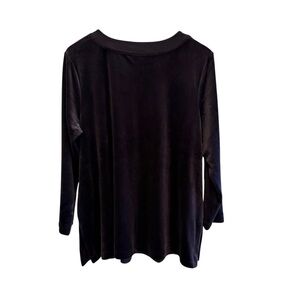 This J. Jill tunic blouse is perfect for any occasion, whether it be a party, cocktail event, or casual day out. The blouse features a V-neckline, long sleeves, and a split on the side with slits. It is made of black velour material with stretch and is relaxed fit. The blouse is available in size XLP and is suitable for plus-size women.