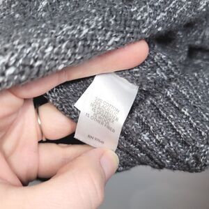 Item: women's long sleeve marled wool blend sweater, dark grey in color with multicolored embroidered lines throughout finished off with tassels, size petite large
