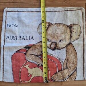 Throw pillow cover, Adorable Panda holding a red suitcase adorned with a kangaroo. Pure linen, designed in Australia, measures 17" width by 15" height. Panda and first portion of caption on the front, the scene continues on the back, finishing the caption. "From Australia with Love" Flax colored background. Brand is "Fast Colours" Purchased new, never used.
