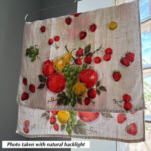 A vintage linen tea towel featuring a colorful fruits print, which includes red apples, green grapes, red strawberries, and yellow pears.