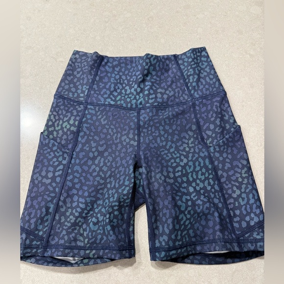 Chic bike shorts with a navy and teal pattern. Ideal for workouts or casual wear.