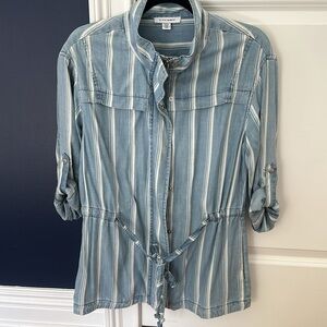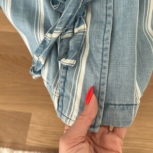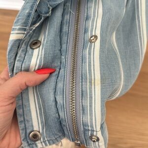 Small light stain at bottom, but is covered when the jacket is closer. The stain is not noticeable when wearing