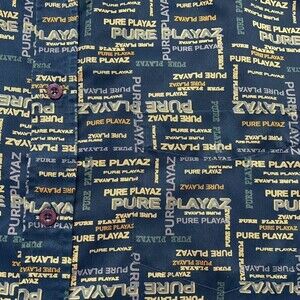 This classic Pure Playaz shirt is pre-owned and in good condition. Crafted of lightweight polyester, it features a navy and orange printed pattern that will make you feel stylish and comfortable all day long. Available in Men's Size XL.