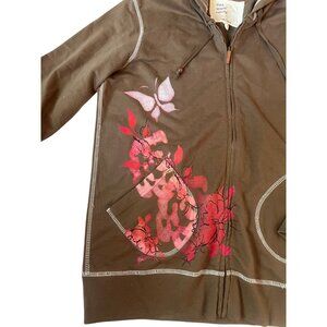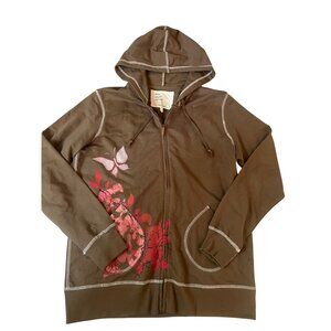 Pure Simple Natural lounge set for women in size L for the top and XL for the bottoms. Made from soft, breathable cotton in a rich brown color with floral accents. Features a relaxed fit, elastic waistband, drawstring closure, and a zip-up hoodie with a floral and butterfly pattern. Excellent condition.