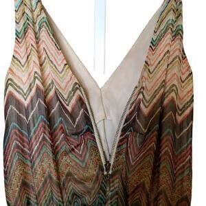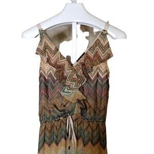Gently used condition, no tears, snags or holes. Pure Sugar zig zag pattern in earth tones. V-neck with ruffled detail, drawstring waist, exposed back zipper. Fully lined, ruffle bottom.