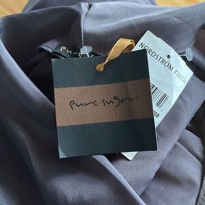 Pure Sugar steel gray center front ruffle strip silky halter. Has a violet undertone. Standup back ruched center neckline. Gentle shark bite hem. NWT. Medium. 100% polyester. Nonsmoking home.