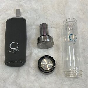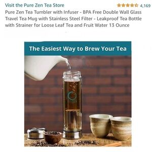 Pure Zen glass tea tumbler 13oz with neoprene sleeve & stainless steel infuser use with hot or cold water. Brew with loose leaf teas or add fruit/herbs to flavor your water. Top and bottom screw on and off, leak free design with neoprene sleeve to protect you from hot beverage. Holds approximately 13 oz. About 9.5” tall