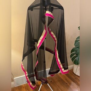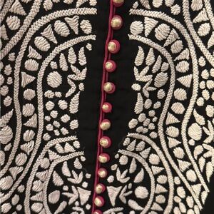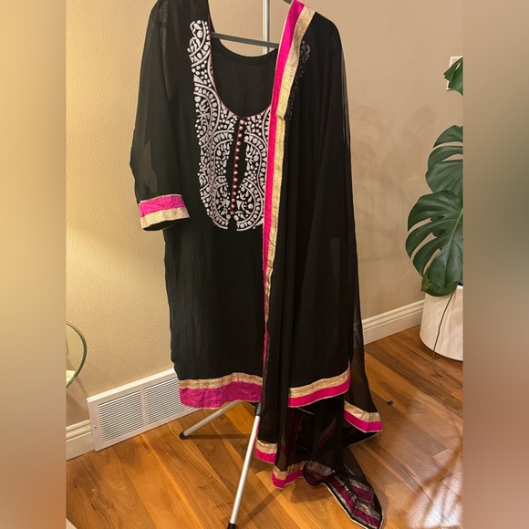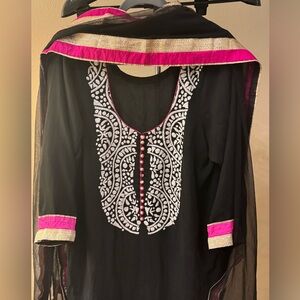 Elegant black kurta set featuring pink and gold trim. Comes with black leggings. Perfect for a stylish look. Excellent condition