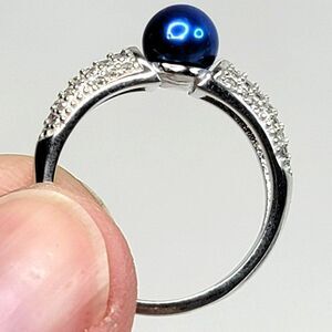 Pure Chic adjustable ring with a bright blue colored authentic freshwater pearl. 925 sterling silver with rhinestones.