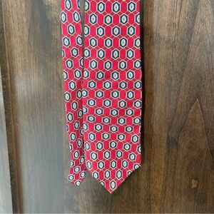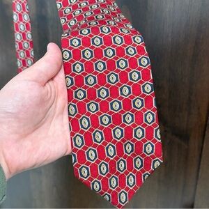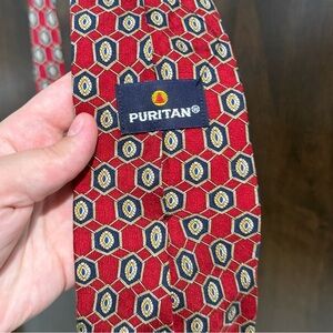 Elevate your style with this Puritan tie, showcasing a bold red hue adorned with a refined geometric pattern. Crafted with a smooth texture, it offers a classic width and length, making it a versatile addition to any formal ensemble. The tie is in pristine condition, ensuring a polished appearance for any occasion.
