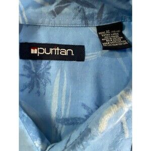 The Puritan Hawaiian Shirt in Men's XL is a vibrant and stylish addition to any wardrobe. Featuring shades of blue with a floral and palm trees print, this short sleeve button-up shirt is perfect for travel, parties, casual outings, and business settings. Made from comfortable rayon fabric and designed for a regular fit, this shirt is adorned with a collared neckline and a left pocket detail.