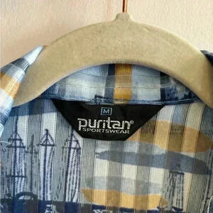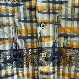 Summery and lightweight button-up shirt from Puritan. Perfect for summer or the beach, and has a mesh-like material and beautiful details of the ocean and sailboats (seen in the up-close pics). In excellent pre-loved condition!