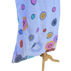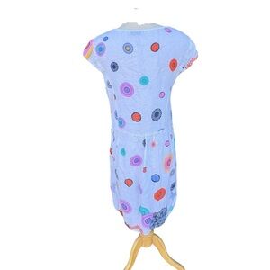 Puro Lino Linen Shift Dress. Colorful art-to-wear circle pattern with ribbed accents at the sides. Cap sleeves & pockets. Size tag removed. This measures as a small/medium-see measurements for best fit.
