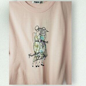 This pink short-sleeve sweatshirt features a stylish "Fashion Lady" embroidery design. Crafted from a soft cotton blend, it provides both comfort and a trendy aesthetic.in excellent condition it doesn't have the size label nor the wash care label from smoke and pet free home