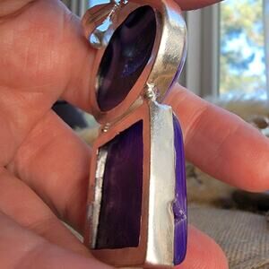 This stunning purple agate geode pendant is a one-of-a-kind statement necklace, featuring a natural agate slice with a sparkling geode center. The top oval stone showcases a unique open geode formation, while the bottom square stone adds a contemporary touch. Set in solid sterling silver, this pendant measures 2.5 x 1 inches and comes with a 20-inch sterling silver chain for effortless wear. Agate is known for its balancing and protective properties, making this an ideal piece for those who love natural gemstone jewelry. The deep purple hues, combined with the intricate silverwork, make it a versatile accessory that complements both casual and elegant styles. Whether you're a boho jewelry lover, a crystal healing enthusiast, or searching for a thoughtful handmade gift, this pendant is a timeless and captivating choice.