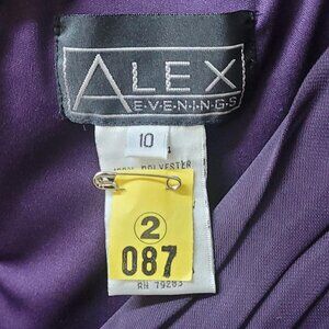 Make a statement at your next formal event with this stunning Purple Alex Evenings dress. This used dress features elegant sheer sleeves that add a touch of sophistication. The pleated design of the dress creates a flattering silhouette, perfect for any evening affair. The deep purple color is rich and regal, sure to turn heads as you enter the room. This size 10 dress is from the renowned brand Alex Evenings, known for their high-quality and stylish formal wear. Whether you're attending a wedding, gala, or cocktail party, this dress is sure to make you feel like the belle of the ball. Elevate your eveningwear collection with this beautiful and timeless piece. #formal #eveningwear