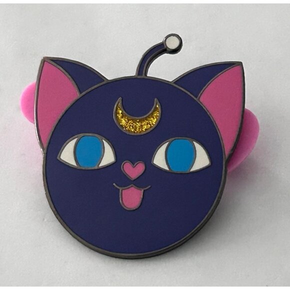 Purple Alien Cat Enamel Lapel Pin Glitter Crescent Celestial Moon