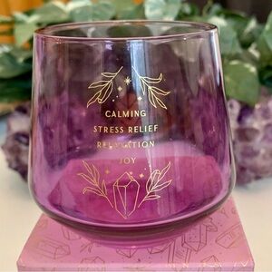 Beautiful Purple Amethyst colored glass with double terminated (DT) quartz wand graphics on front and back and the words 'Calming Stress Relief Relaxation Joy' written in gold lettering on the front.