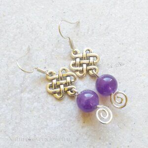 Came across this pair of dark purple Amethyst beads and decided to turn them into a one-of-a-kind pair of dangle earrings. The handshaped & swirled silver plated headpin and the Celtic Knot connector gives them a bit of a playfully feminine vibe, that can go with a huge variety of clothing styles and is suitable for women of any age to wear.