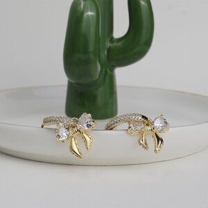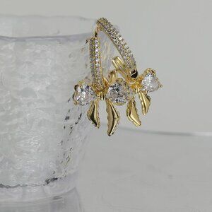 Delicate dangle bow small hoop earrings, cute ribbon huggie, featuring a simple pave rhinestone ring and a swinging sailor ribbon, adorned with sparkly heart shaped cubic zirconia, creates a truly dazzling and charming design.