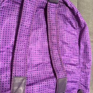 Stylish purple backpack with black star print and brown leather trim. Small rip on the top. Spacious interior. Perfect for daily use.