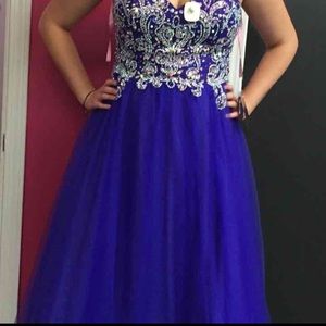 Size 14 but it has a corset back so you are able to tighten/loosen it. Worn for 45 minutes at the Miss CT pageant. Great condition. (Second picture has a shadow from the camera guy)