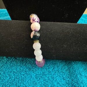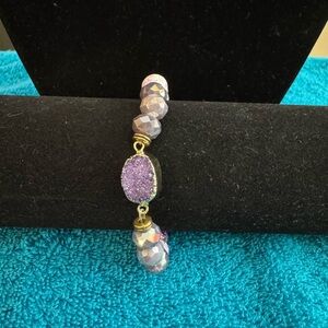 Elegant bracelet with purple beads. Features a sparkling purple druzy centerpiece. Gold accents add a touch of luxury. New W/o Tags