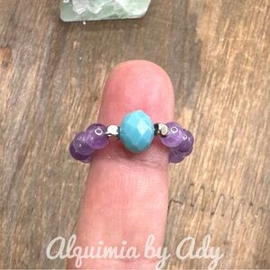 This stunning ring showcases translucent purple beads, reminiscent of amethyst, elegantly paired with a silver charm. A vibrant turquoise accent bead adds a unique touch, making it a standout piece in any jewelry collection.