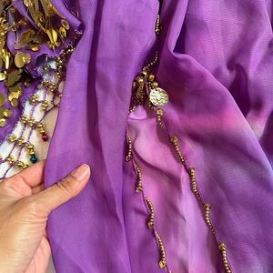 Vibrant purple belly dance costume adorned with gold accents. Perfect for performances.New