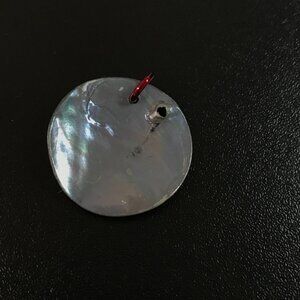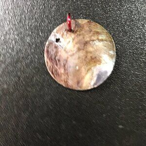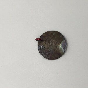 This round disc pendant is made out of Black Lip Shell. It is a bluish purple color and the iridescent nature of it causes it to change color in different light. I used a red anodized aluminum jump ring as a bail.